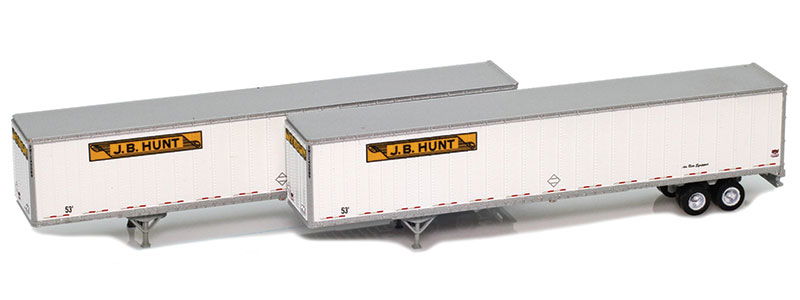 2-pack of 53’ trailers. The 53' trailers are all new tooling from AZL. The trailers feature wheels that turn, the ability to reposition the wheels. Set comes with 2 trailer legs retracted (for when the trailer is on the tractor) can be swapped with legs installed on the trailer.