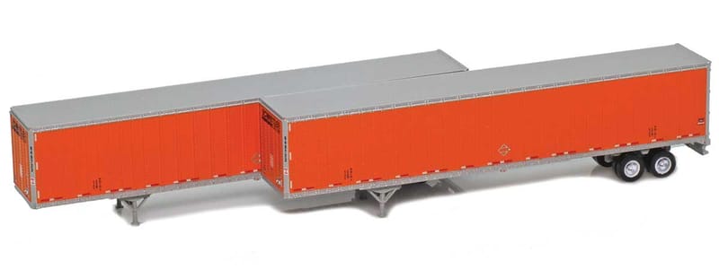 2-pack of 53’ trailers. The 53' trailers are all new tooling from AZL. The trailers feature wheels that turn, the ability to reposition the wheels. Set comes with 2x Trailer legs retracted (for when the trailer is on the tractor) can be swapped with legs installed on the trailer.